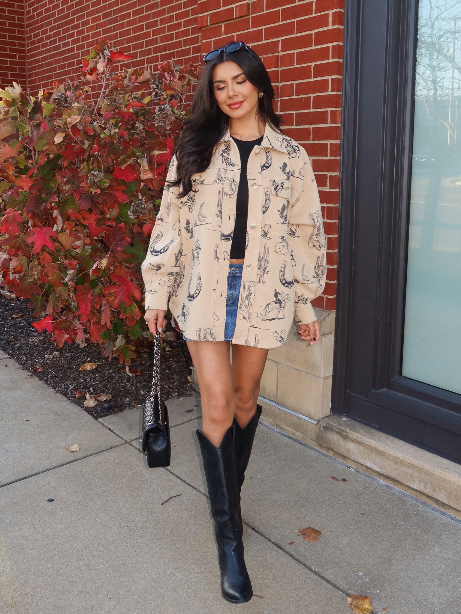 Introducing our NEW Wild West Oversized Shacket! Style our Tucker Wild West Oversized Shacket buttoned up with a basic underneath. black leggings. and black boots for a comfy yet western chic look. Elevate the look with a slick back bun and gold jewelry!